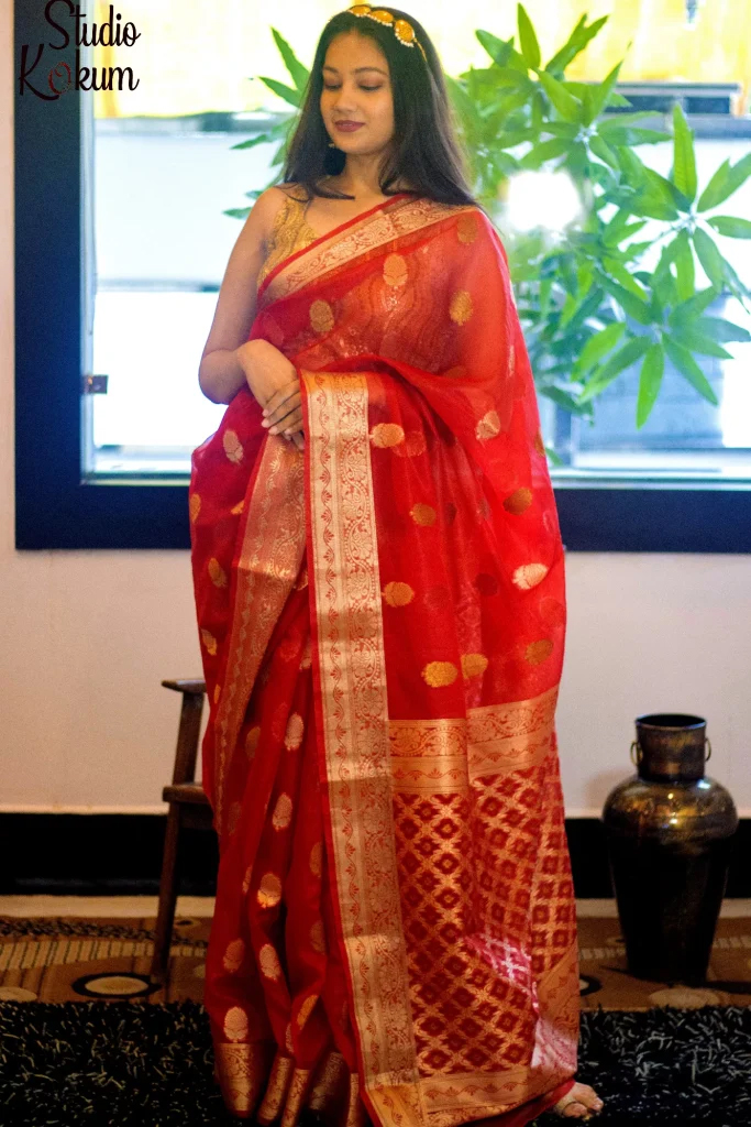 Choose ‘Surkh Sitara – Red Organza Banarasi’ on Navami to wear for the traditional style while remaining as comfortable as possible. Pair it with Mayajaal – Golden Rich Silk Sequins Embroidery Blouse for the chic yet gorgeous look. The heels, along with golden accessories, give the outfit a Navami night party feel.