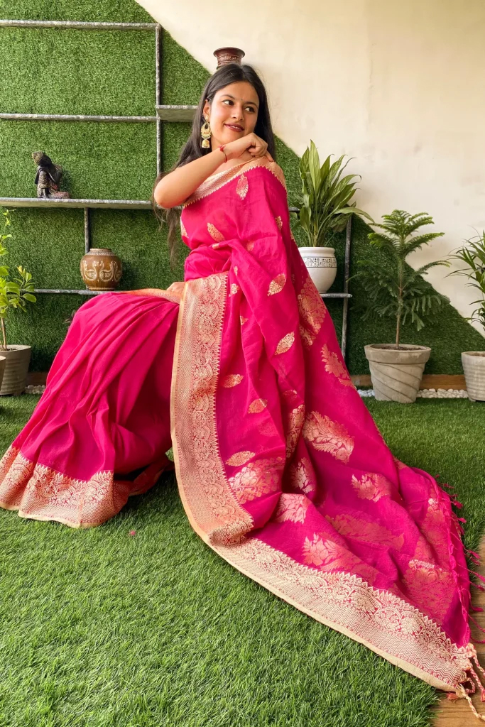This year, we will again get dressed and assemble at the mandap for Pushpanjali as we used to do on Ashtami morning. After two years of break and celebrating puja at home, we don’t want to miss any opportunity to enjoy every single moment of celebrations. Having an adda at pandal and eating delicious bhog with your family is bliss. And for such celebrations plans, Ashtami should choose an Alluring Arasi – Fuchsia Handloom Pure Linen Banarasi with that ideal luster and grace.