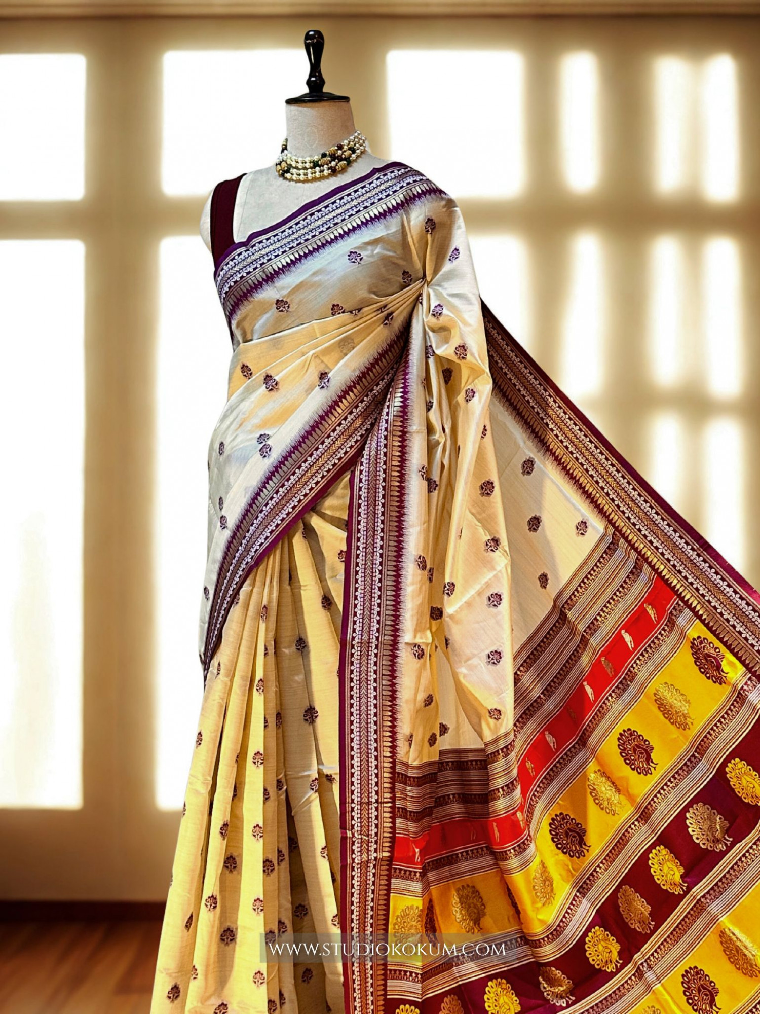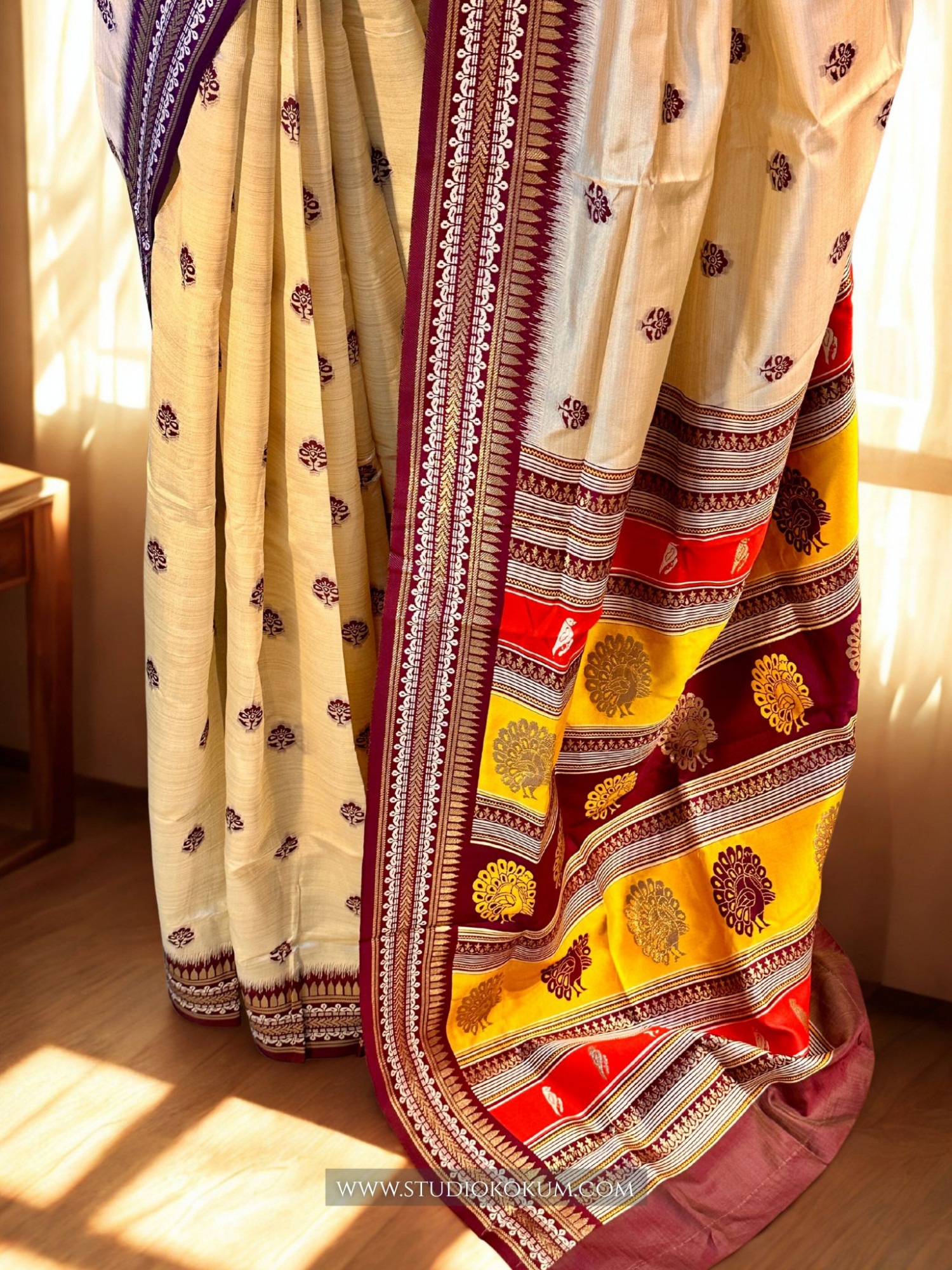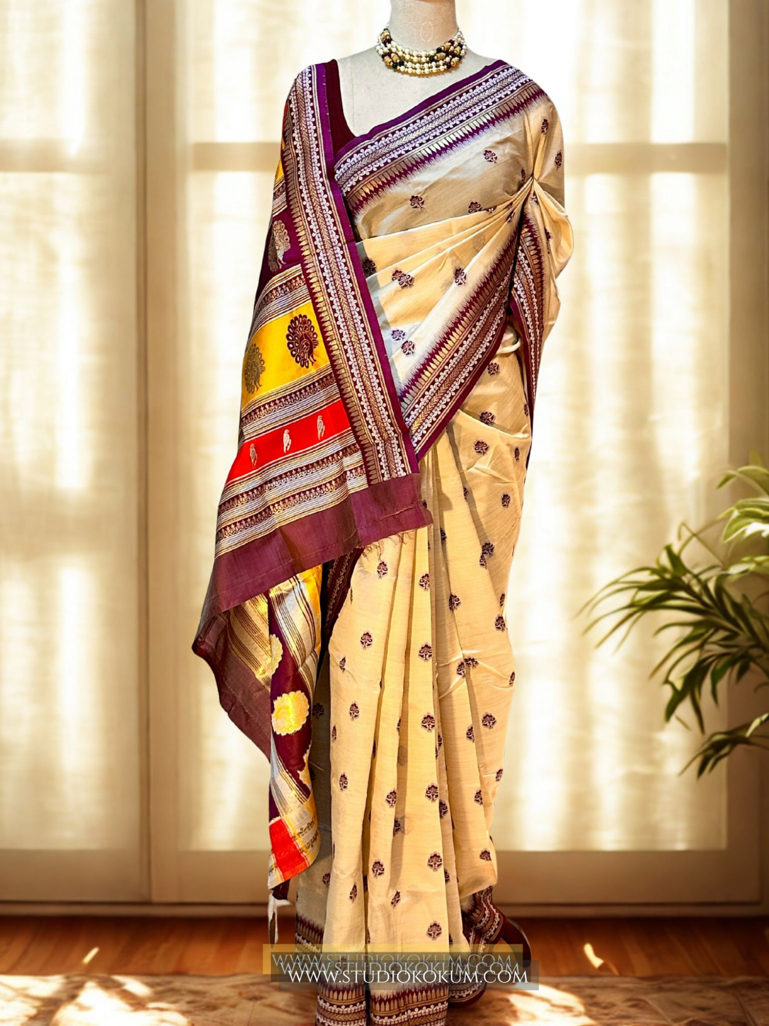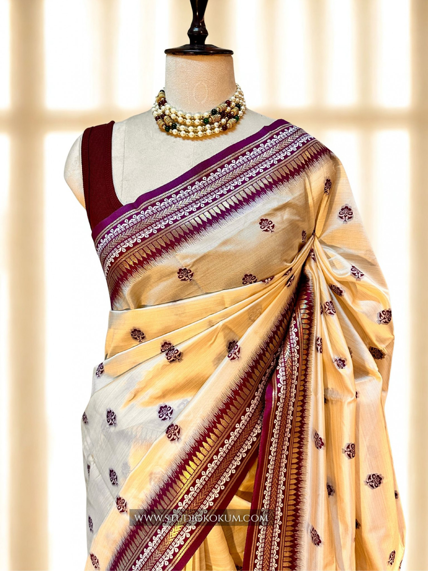 Assam silk is celebrated for its rich texture and natural golden hue. Highly durable, it grows more lustrous with time. This saree features a woven border and pallu, adorned with woven Assamese zari and Muga motifs inspired by the traditional Assam Gamocha.
