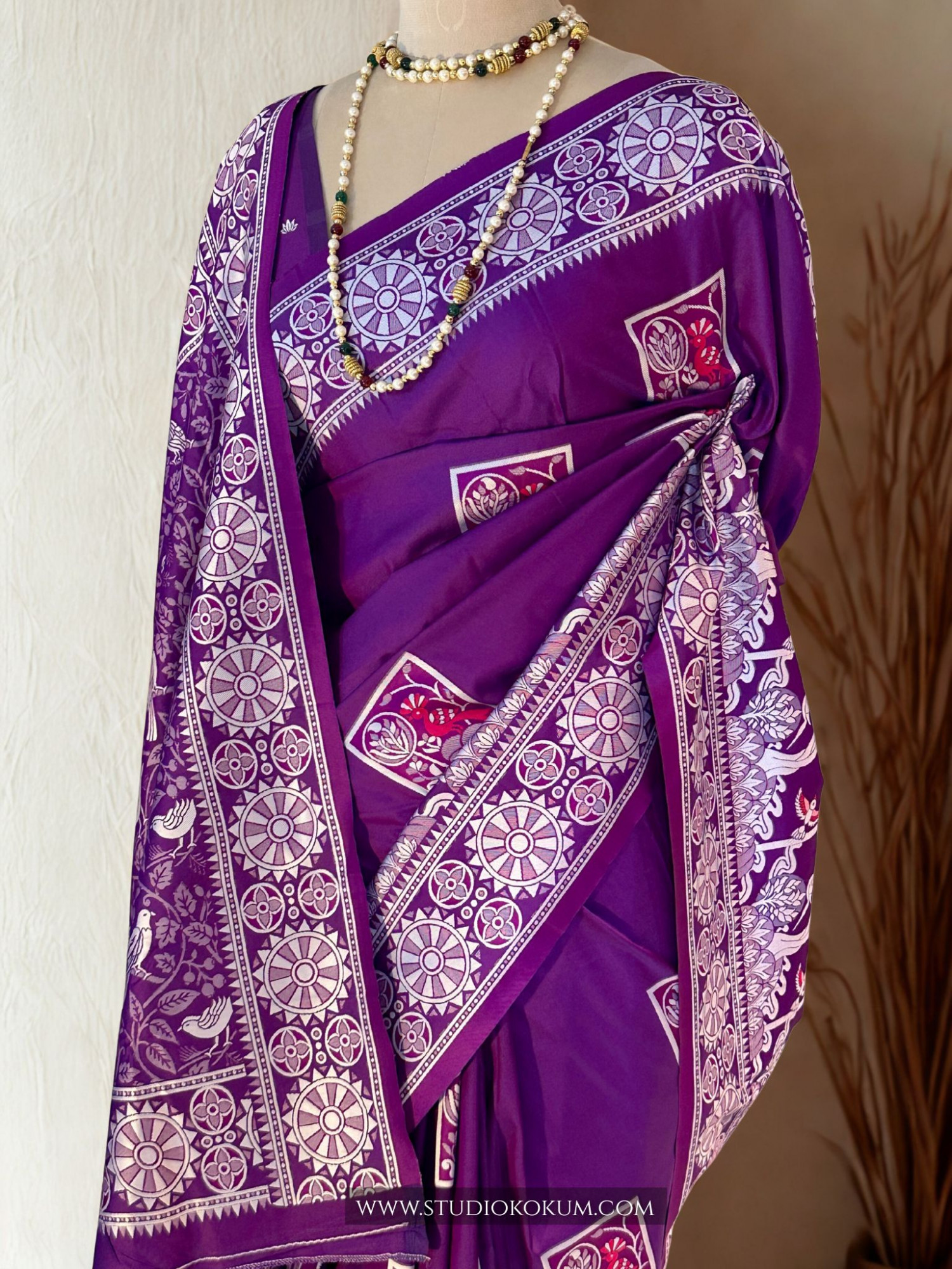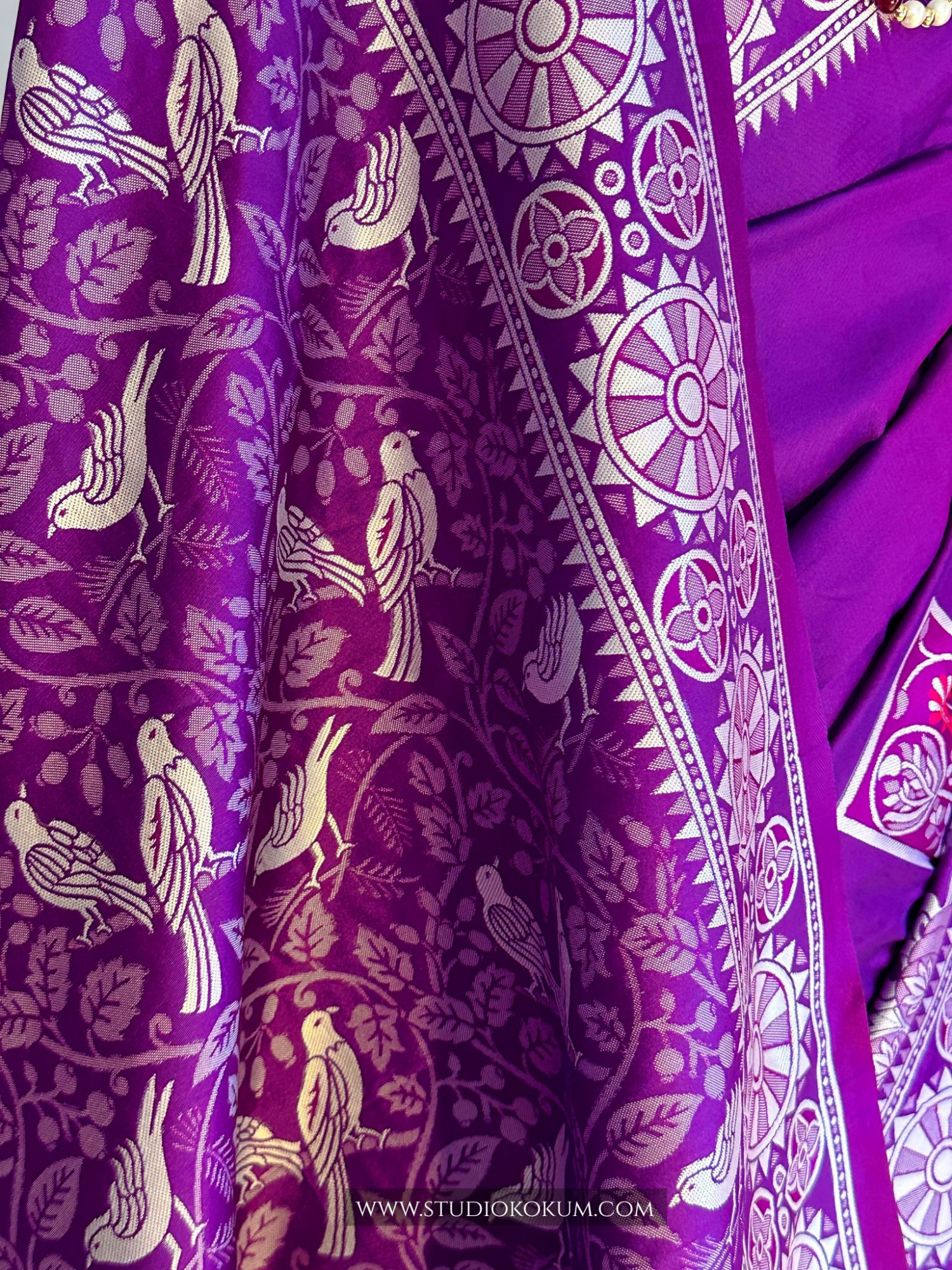Fabric: Handwoven in fine mulberry silk, this saree offers natural sheen, soft texture, and elegant drape—crafted through generations of tradition.It has intricate, traditional birds motifs, vibrant purple colors and is certainly a staple for festive and formal wear.