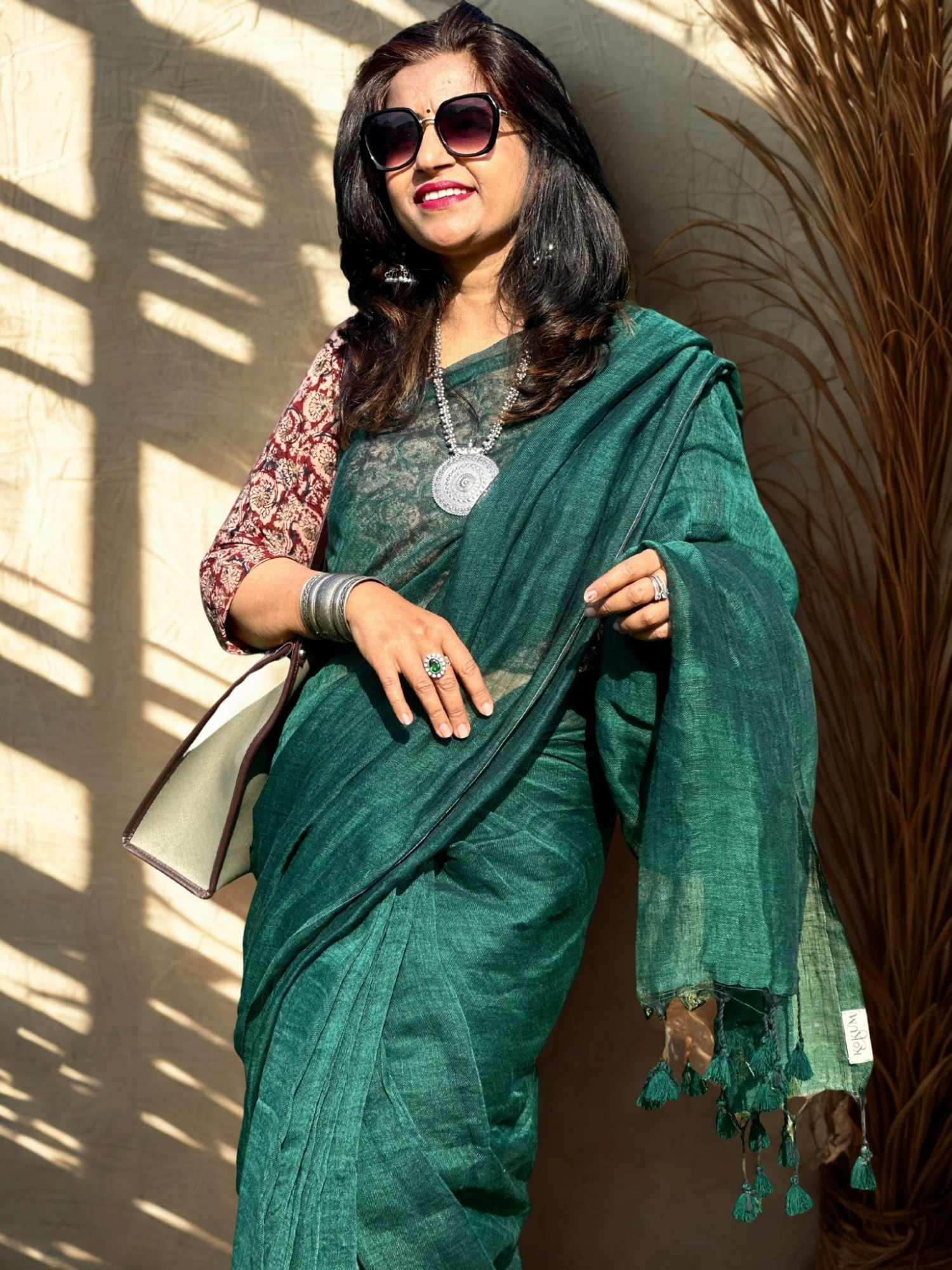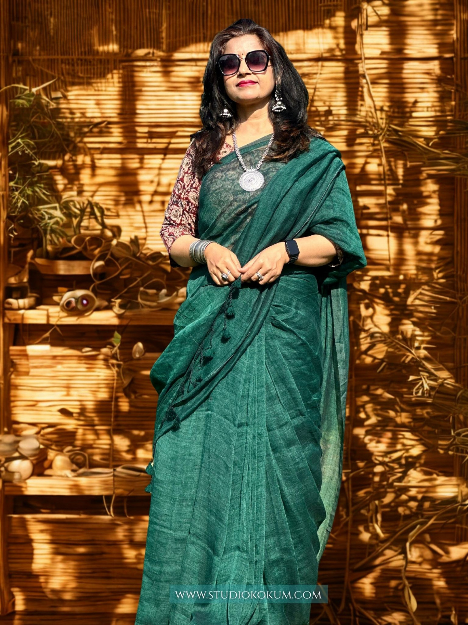 ANAYAA : GREEN HANDWOVEN LINEN SAREE COMES WITH ITS OWN ANAYAA LINEN BLOUSE