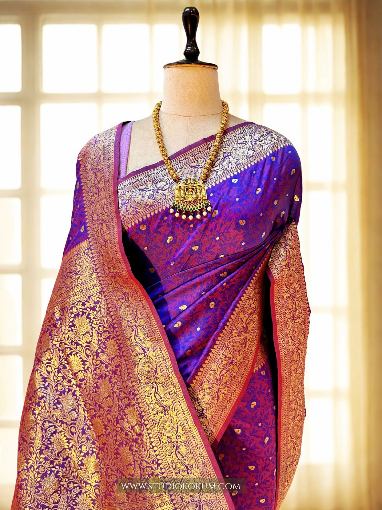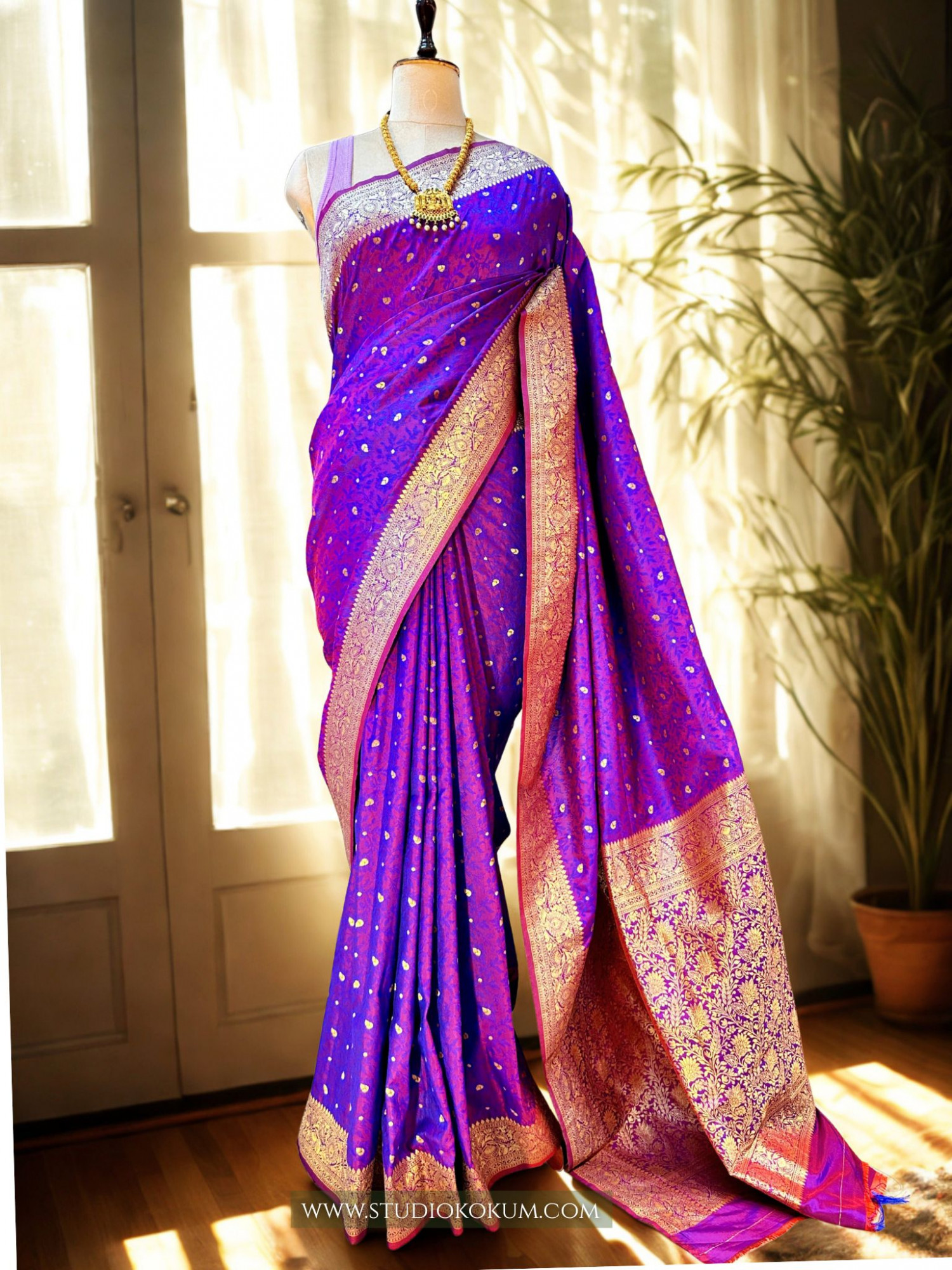 Bhama: The stunning Tanchoi saree in a beautiful dual-tone shade of purple, crafted from katan silk and adorned with intricate zari brocade throughout. The entire saree boasts delicate gold zari work, complemented by a gold zari border and a lavish brocade pallu.