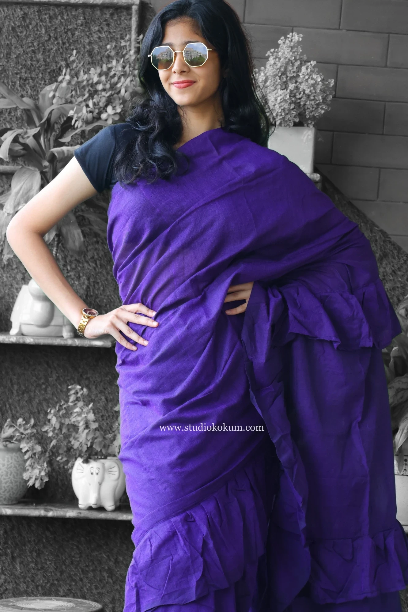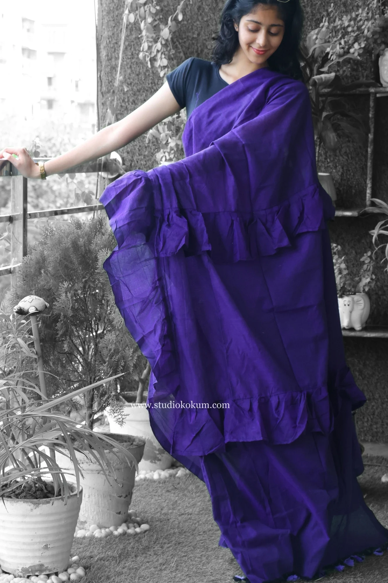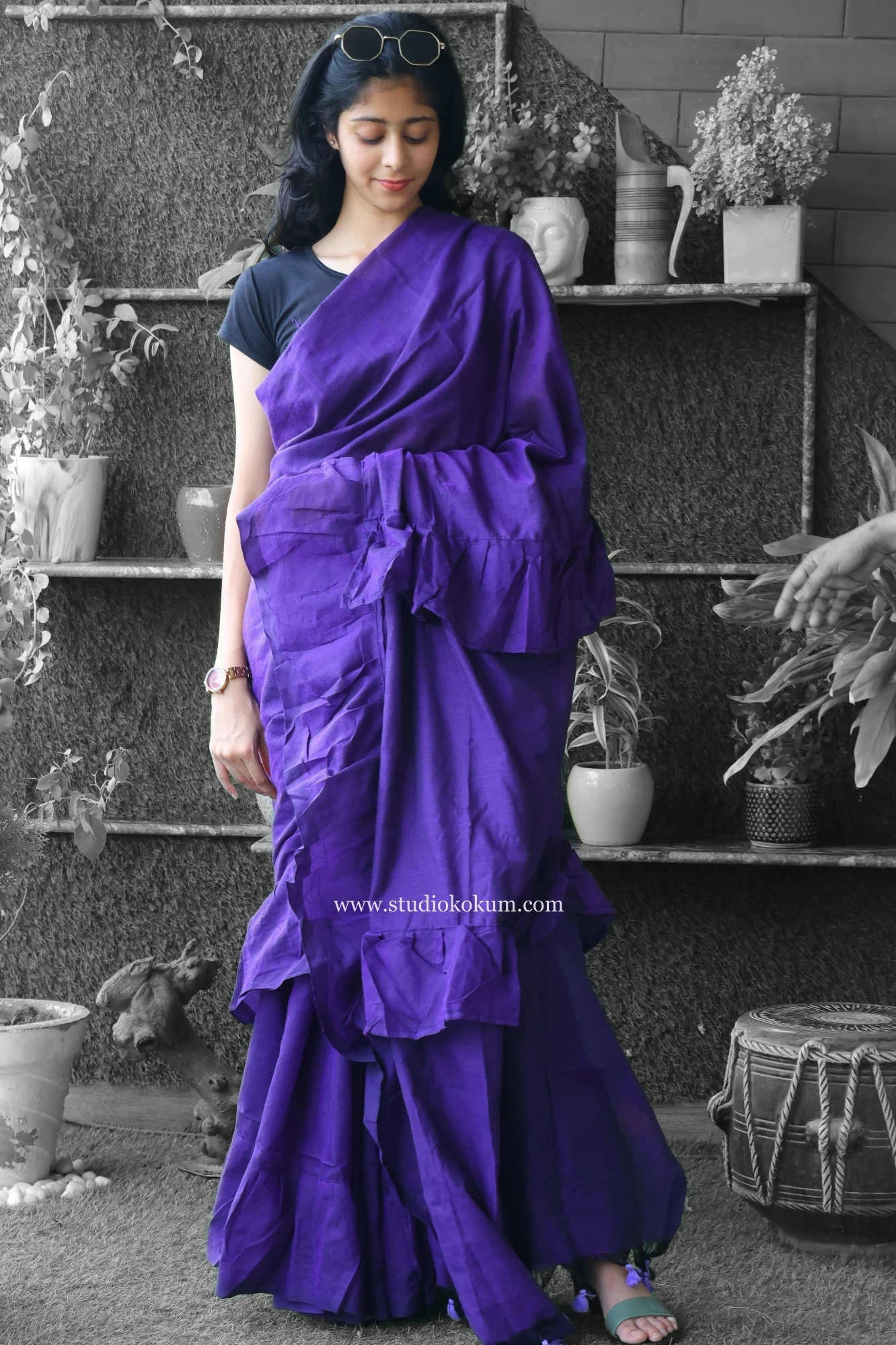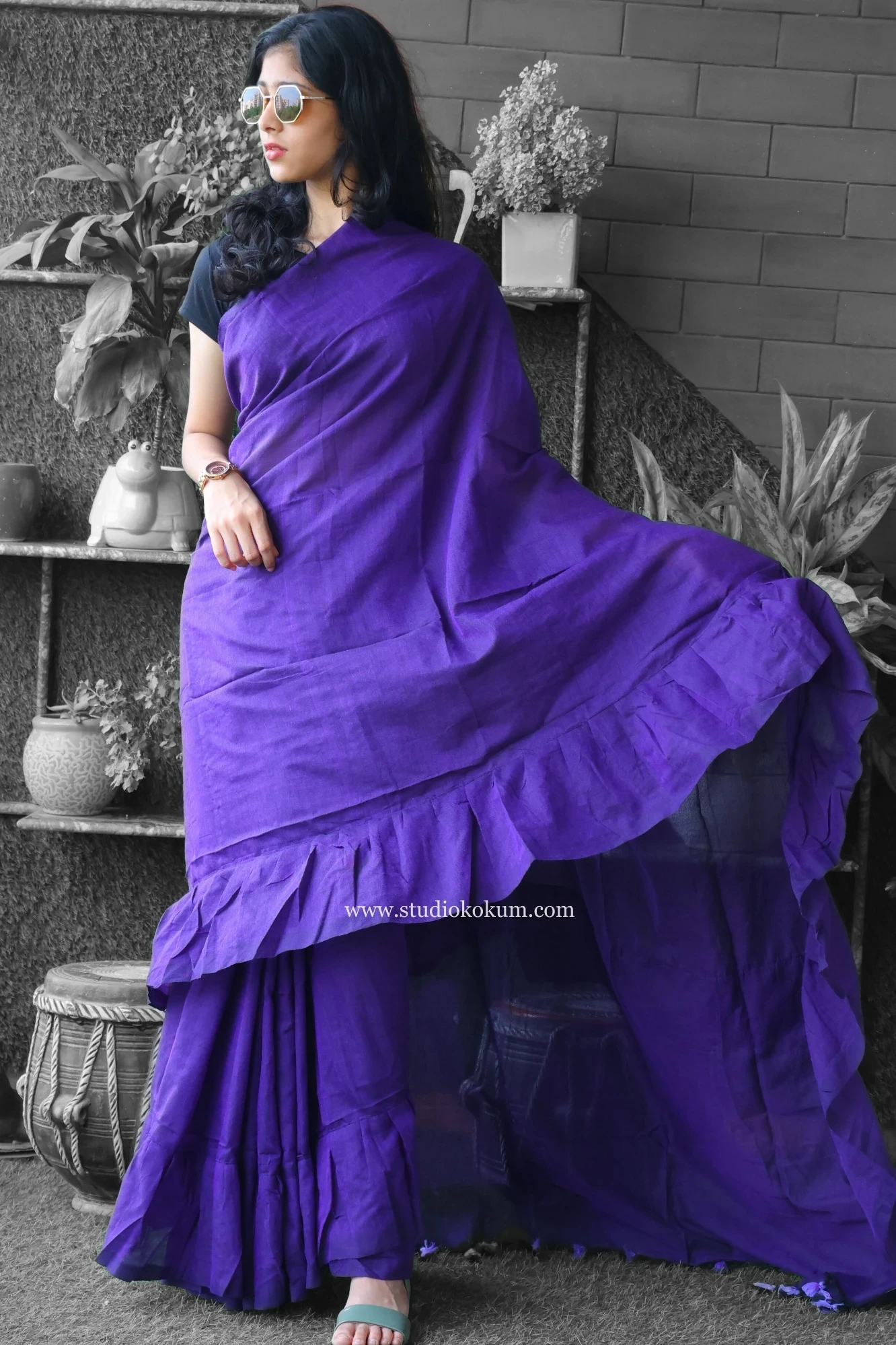 With Cool Kokila Ruffle Saree in Fuchsia Purple, which is inspired by the beauty of birds in their full plumage, soar into a world of grace and elegance! The saree is a beautiful blend of softness and vivacity, much like the vibrant feathers of a tropical paradise.Cool Kokila is a work of art made of luxurious cotton and embellished with frivolous frills that resemble our feathered friends' delicate feathers.