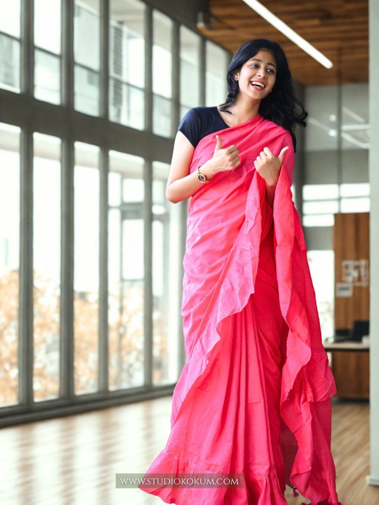 With Giggly Gaurayya Ruffle Saree in Pink, which is inspired by the beauty of birds in their full plumage, soar into a world of grace and elegance! The saree is a beautiful blend of softness and vivacity, much like the vibrant feathers of a tropical paradise.Giggly Gaurayya is a work of art made of luxurious cotton and embellished with frivolous frills that resemble our feathered friends' delicate feathers.