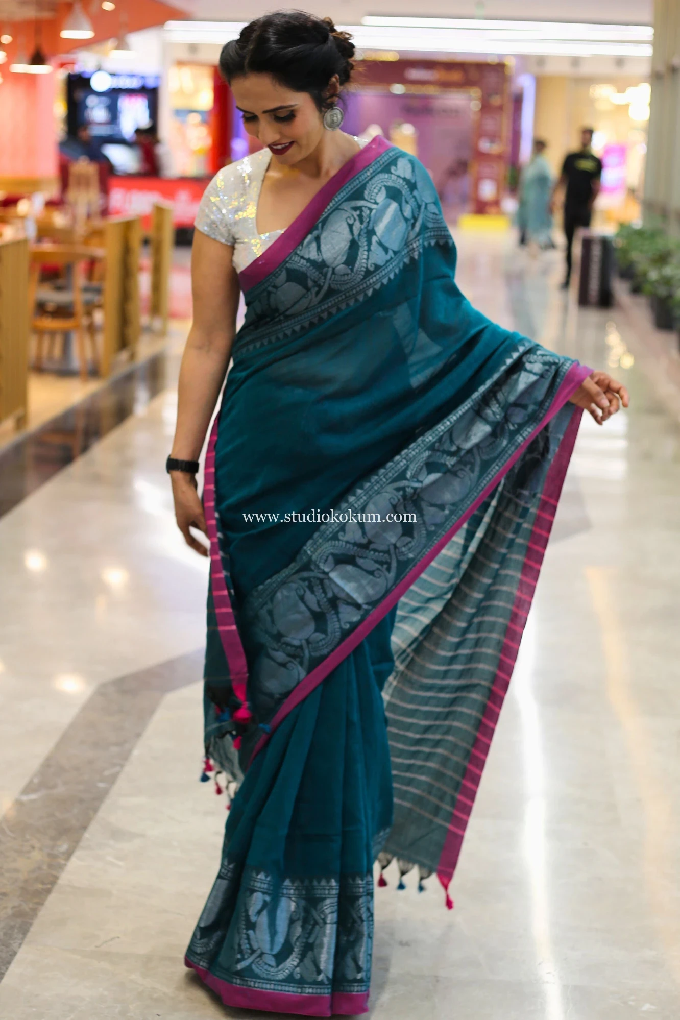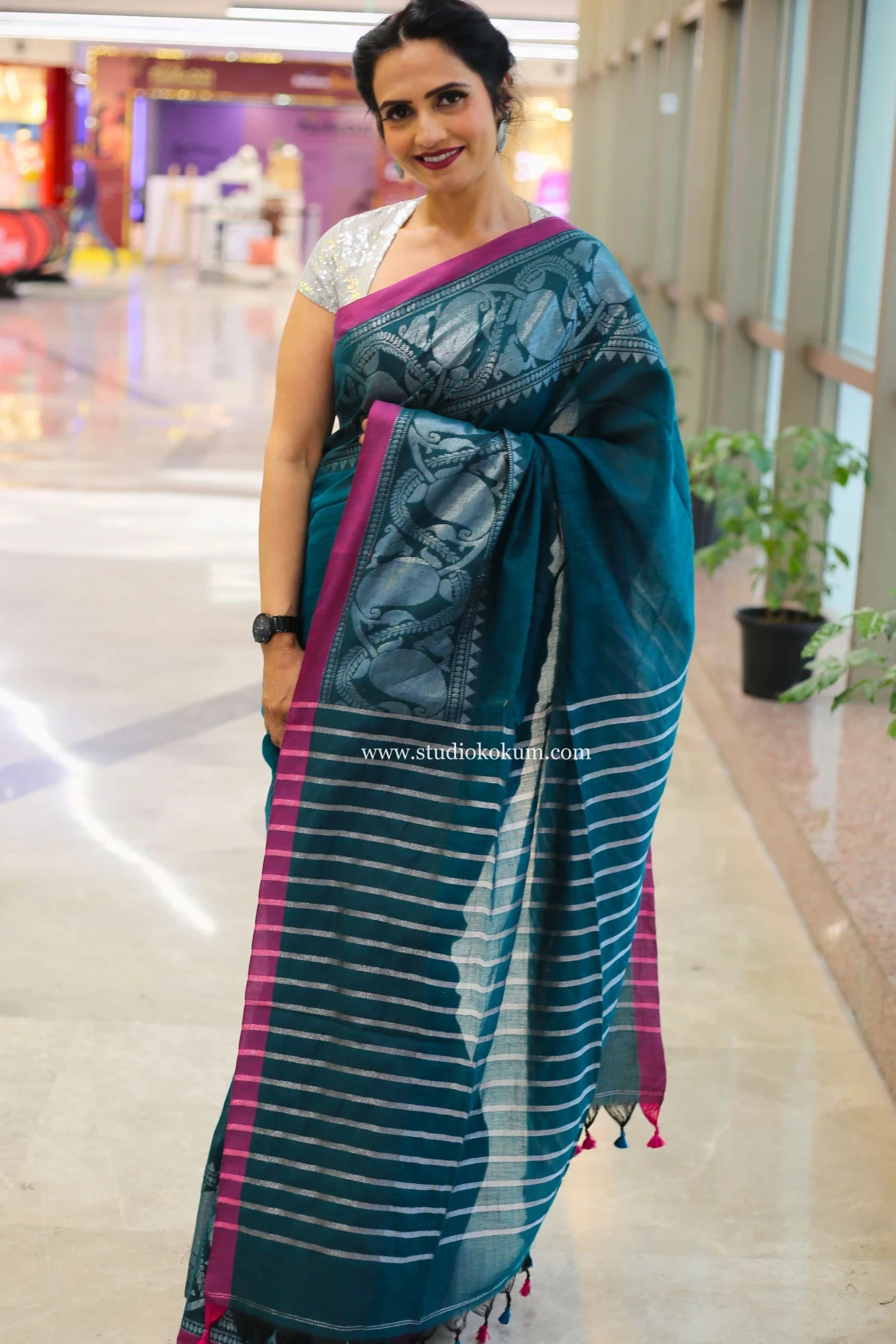Fabric: Guldasta is woven from the finest quality cotton, making it a comfortable and breathable choice for all-day wear. The captivating silver zari weaving on this deep teal saree, which features conventional designs.