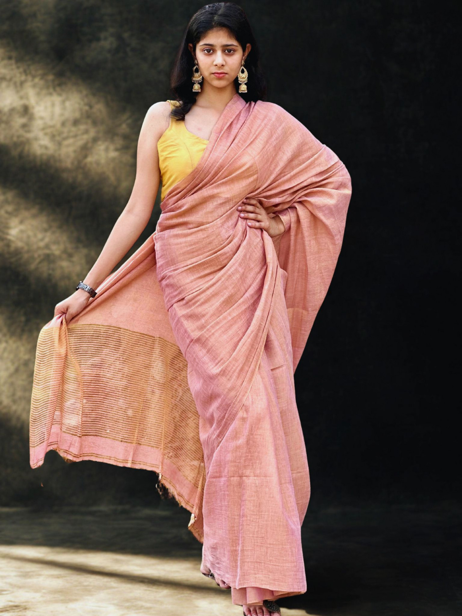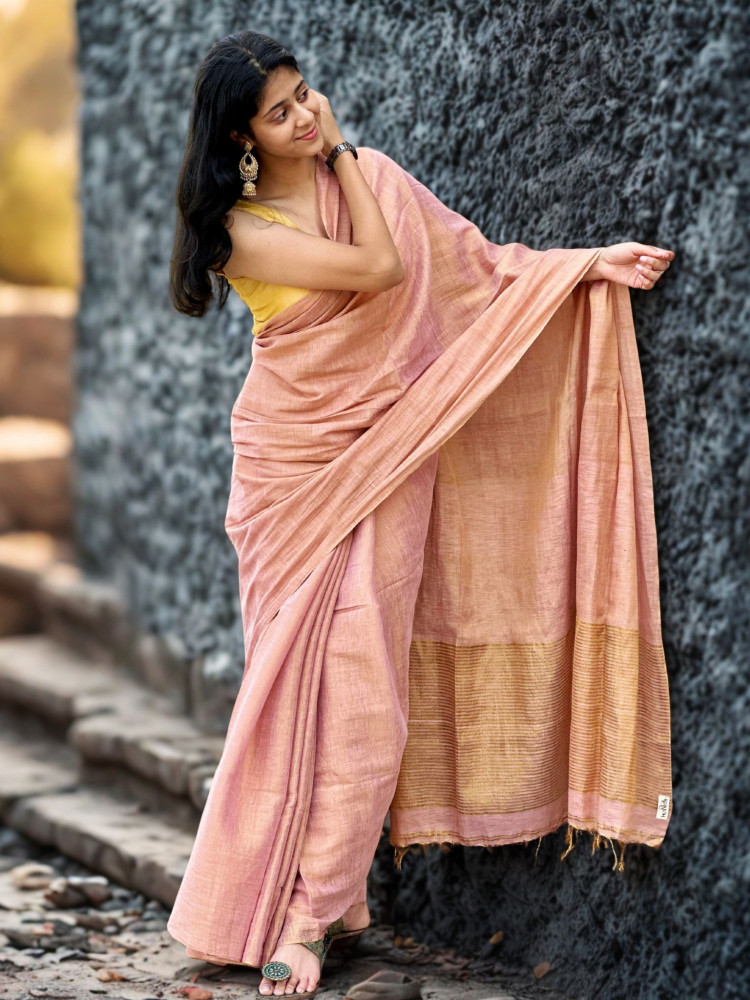 Linen Tissue fabric is a luxurious fabric that combines the natural texture of linen with the opulent shine of zari. Tissue is woven into the linen to create magic and the result is a fabric that is both lightweight and rich, perfect for elegant sarees. This blend offers the comfort of linen with the grandeur of tisue.