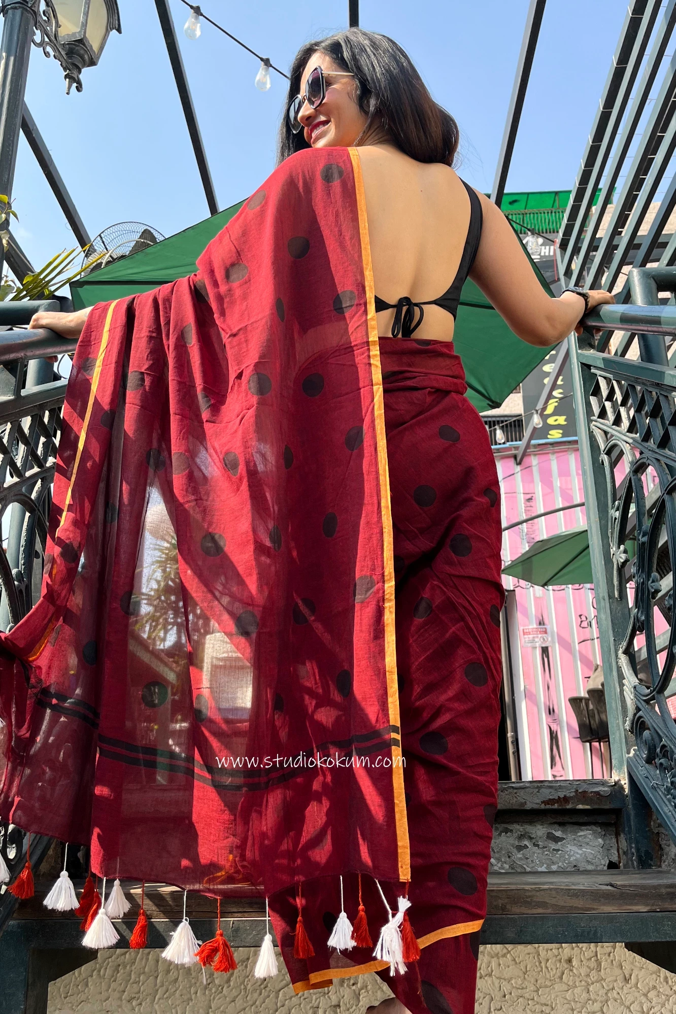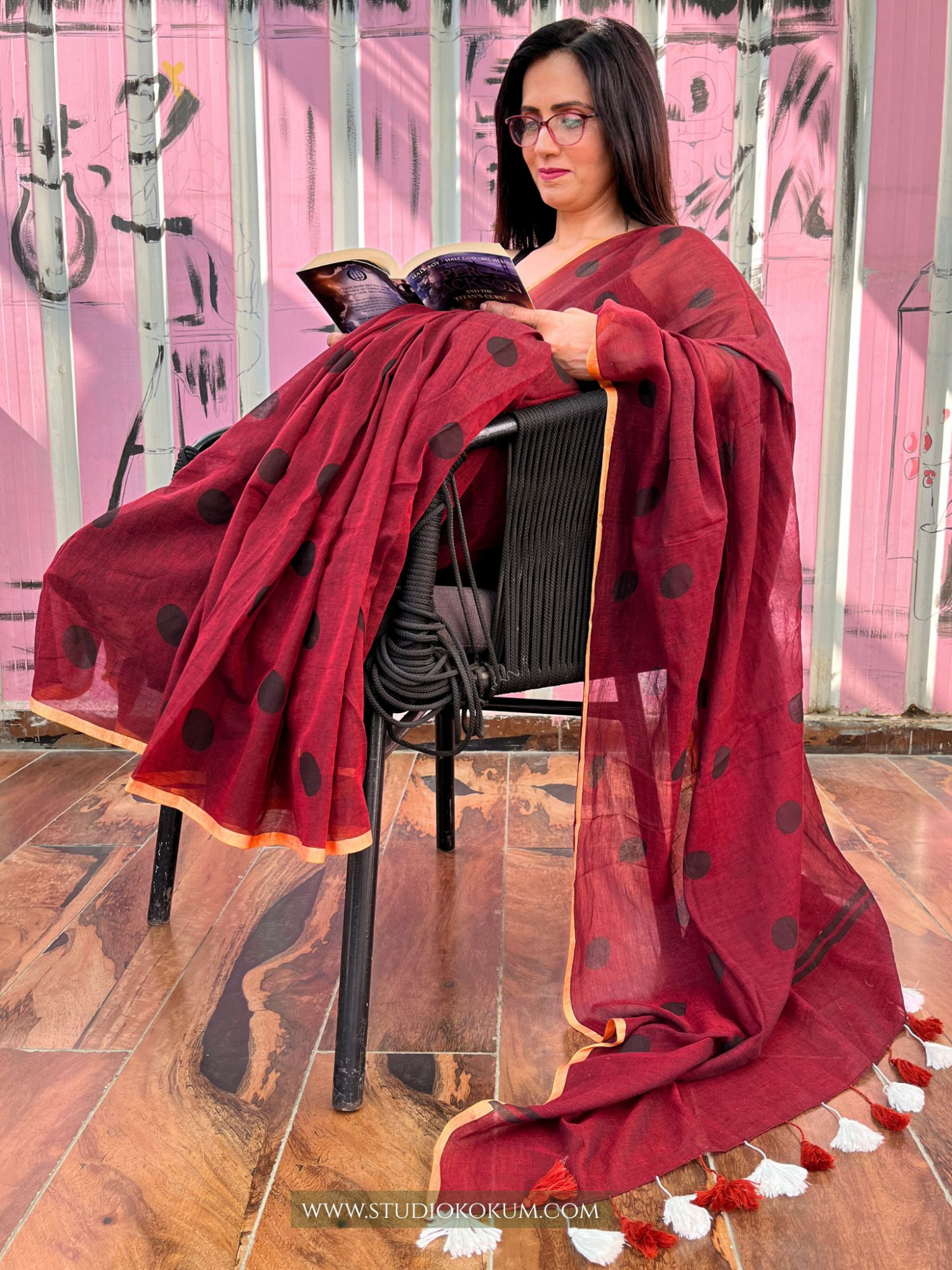 Kentucky Kiss - Pure Mul Polka Dots Saree in Maroon Colour