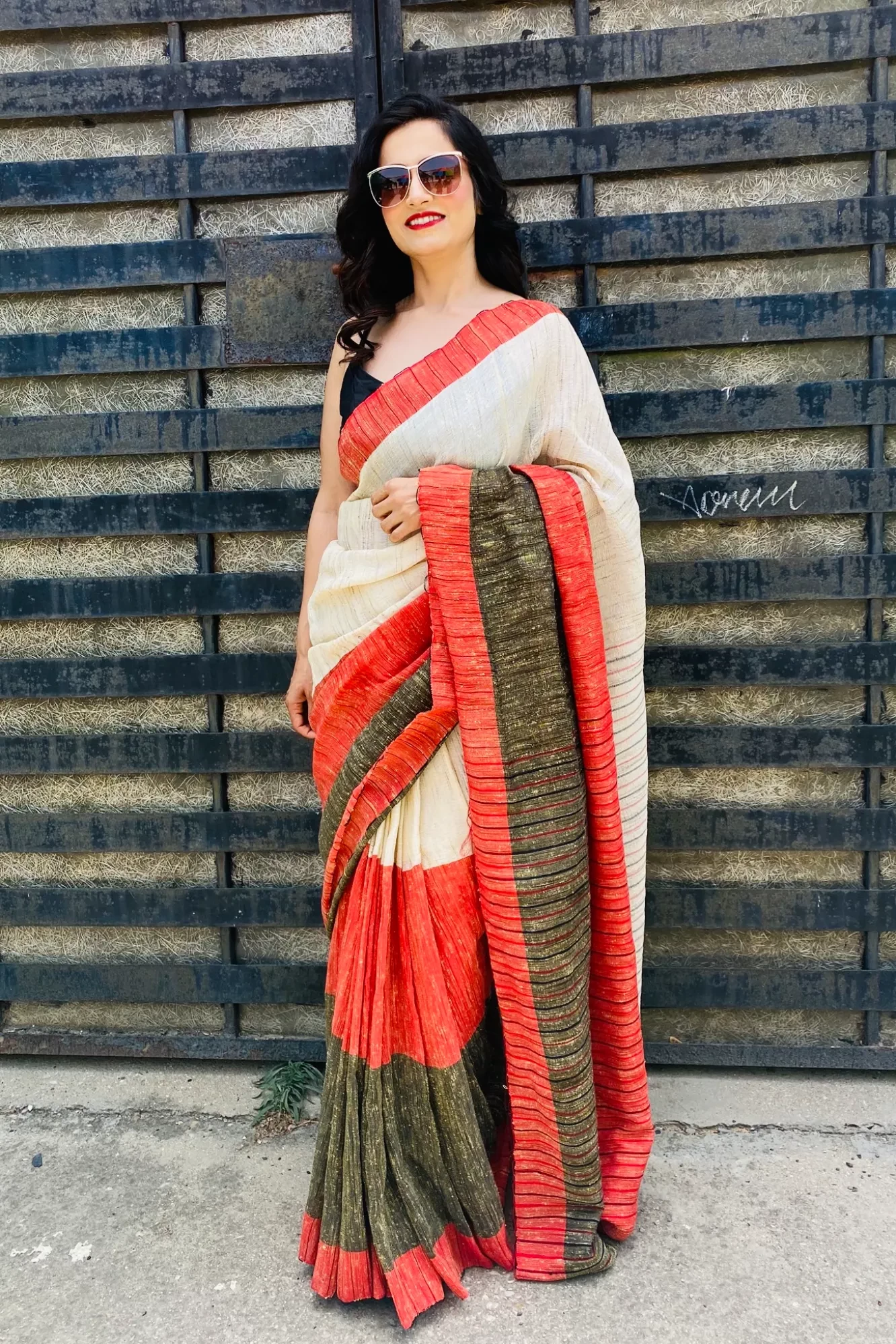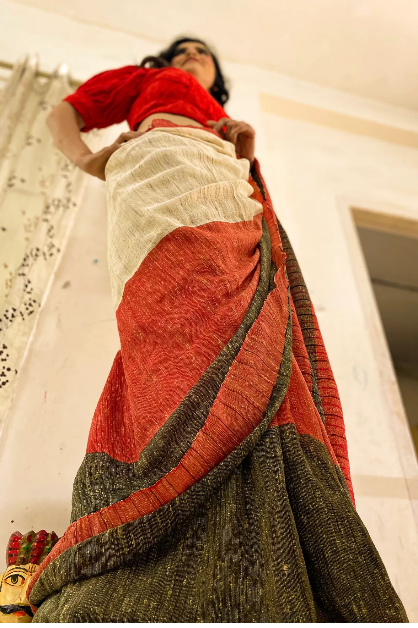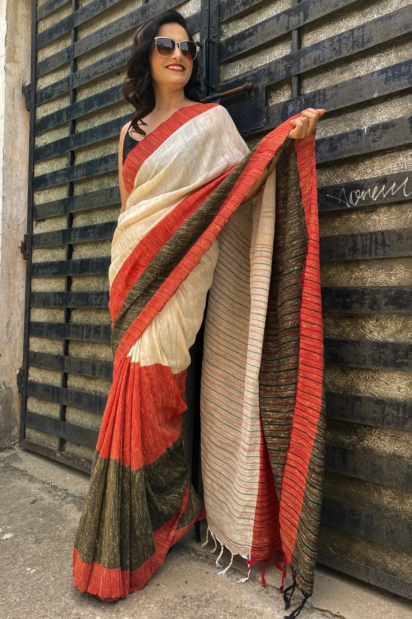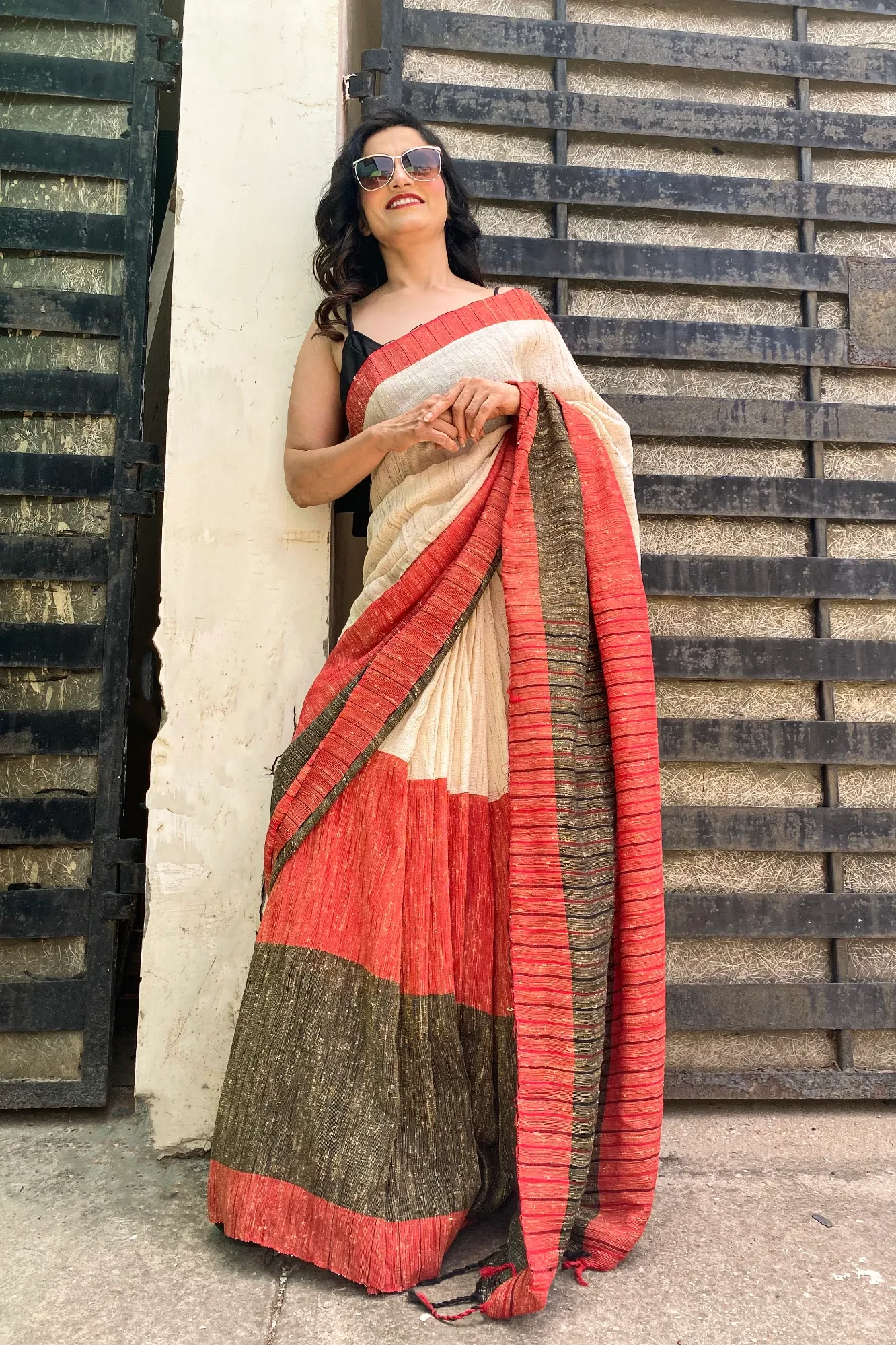 Lal Kinara - Beige, Black N Red Handloom Jute Cotton Saree