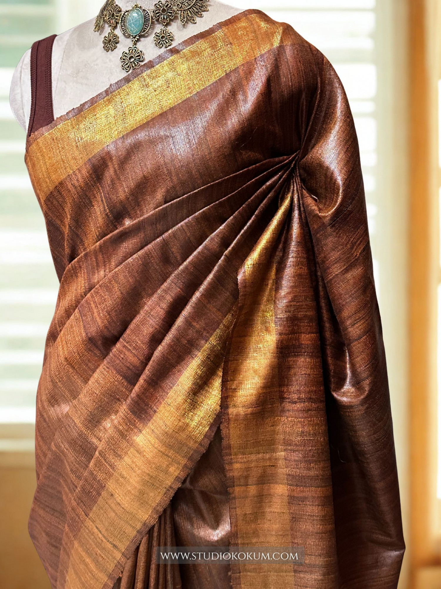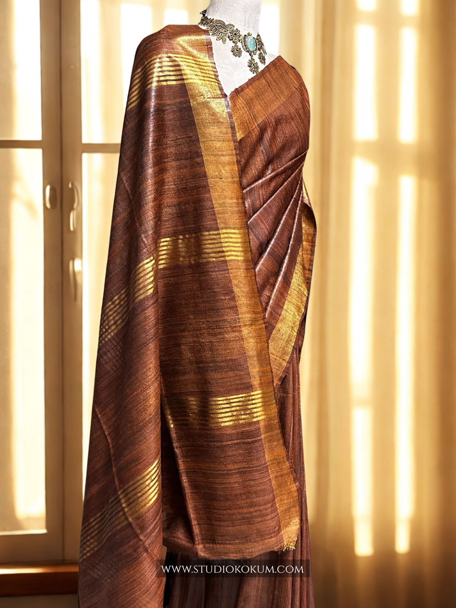Mahika: Brown Woven Pure Tussar Silk Saree, comes with a SIlk Mark Certificate.