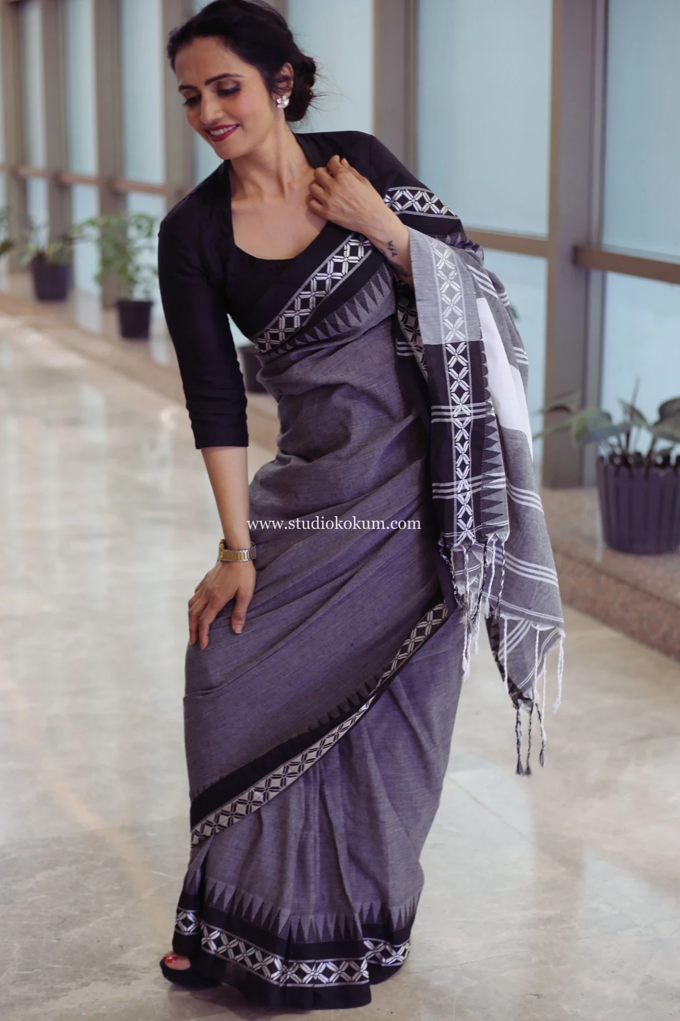 Meraki - Handloom Grey Black White Cotton Saree with Blouse