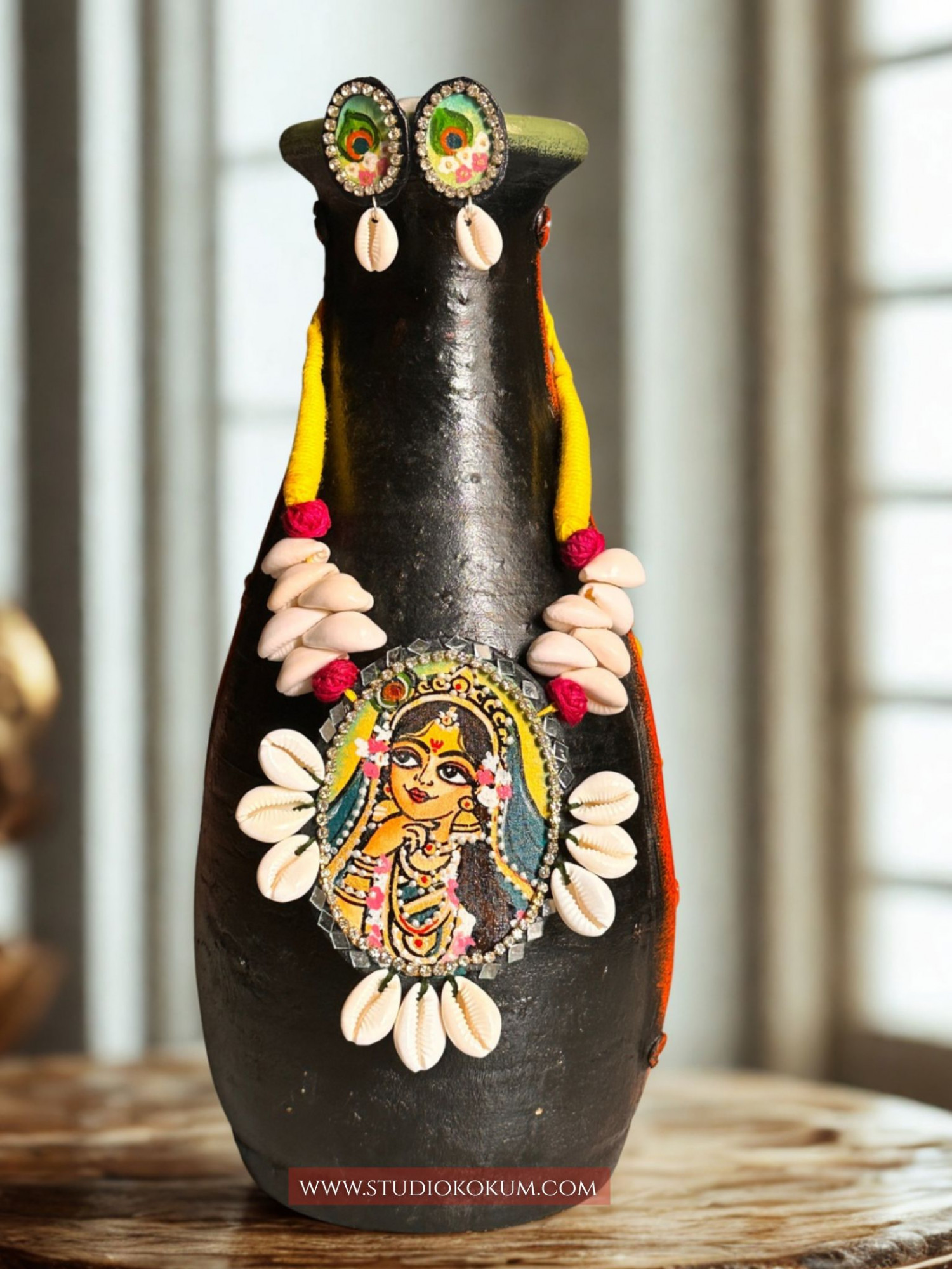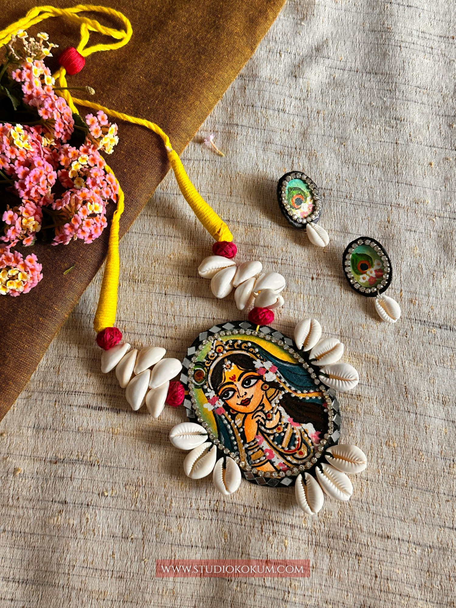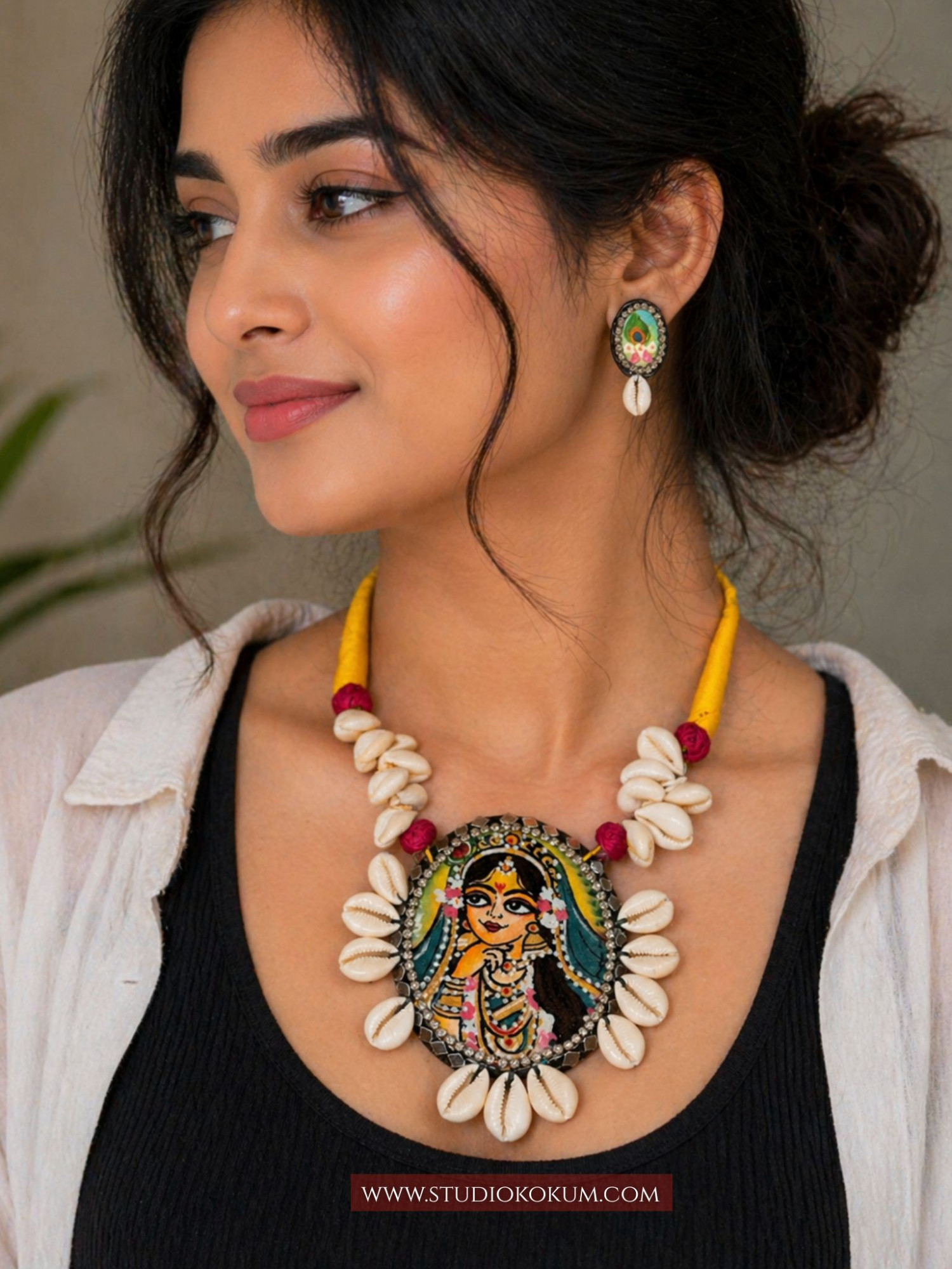 Lightweight and full of charm, this neckpiece set reflects the grace, joy, and poetry of new beginnings. Naveli captures the glow of a new bride, beautifully handpainted on a delicate cardboard canvas.