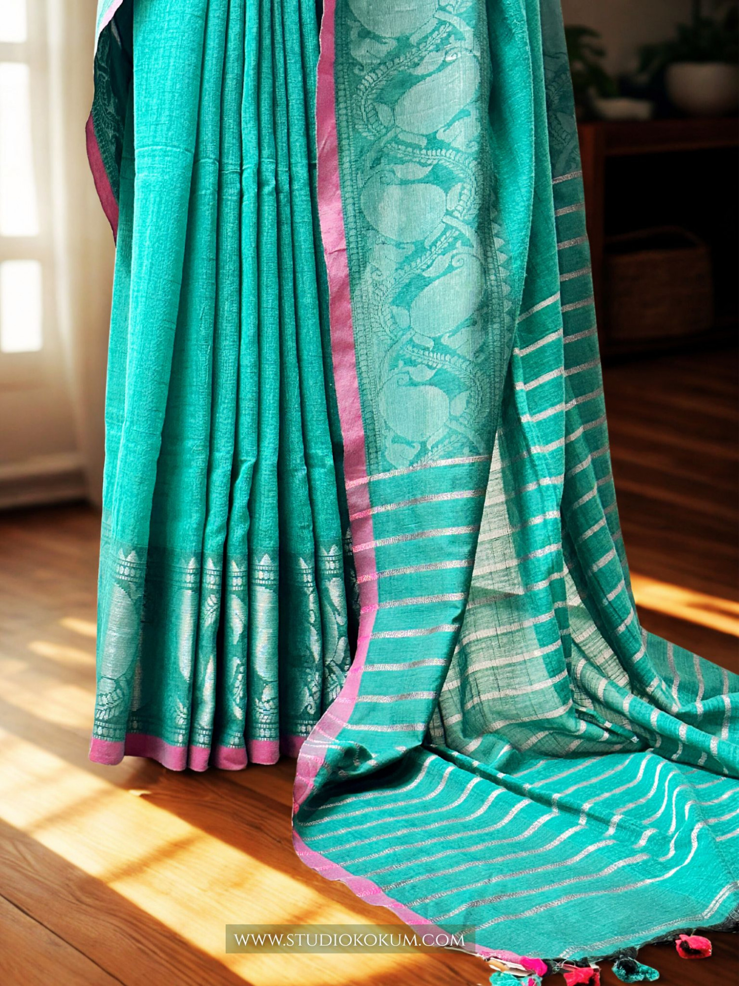 Fabric: Noorani is woven from the finest quality cotton, making it a comfortable and breathable choice for all-day wear. The captivating silver zari weaving on this light teal color saree, which features conventional designs that highlight the great skill of our artists, brings this piece to life.