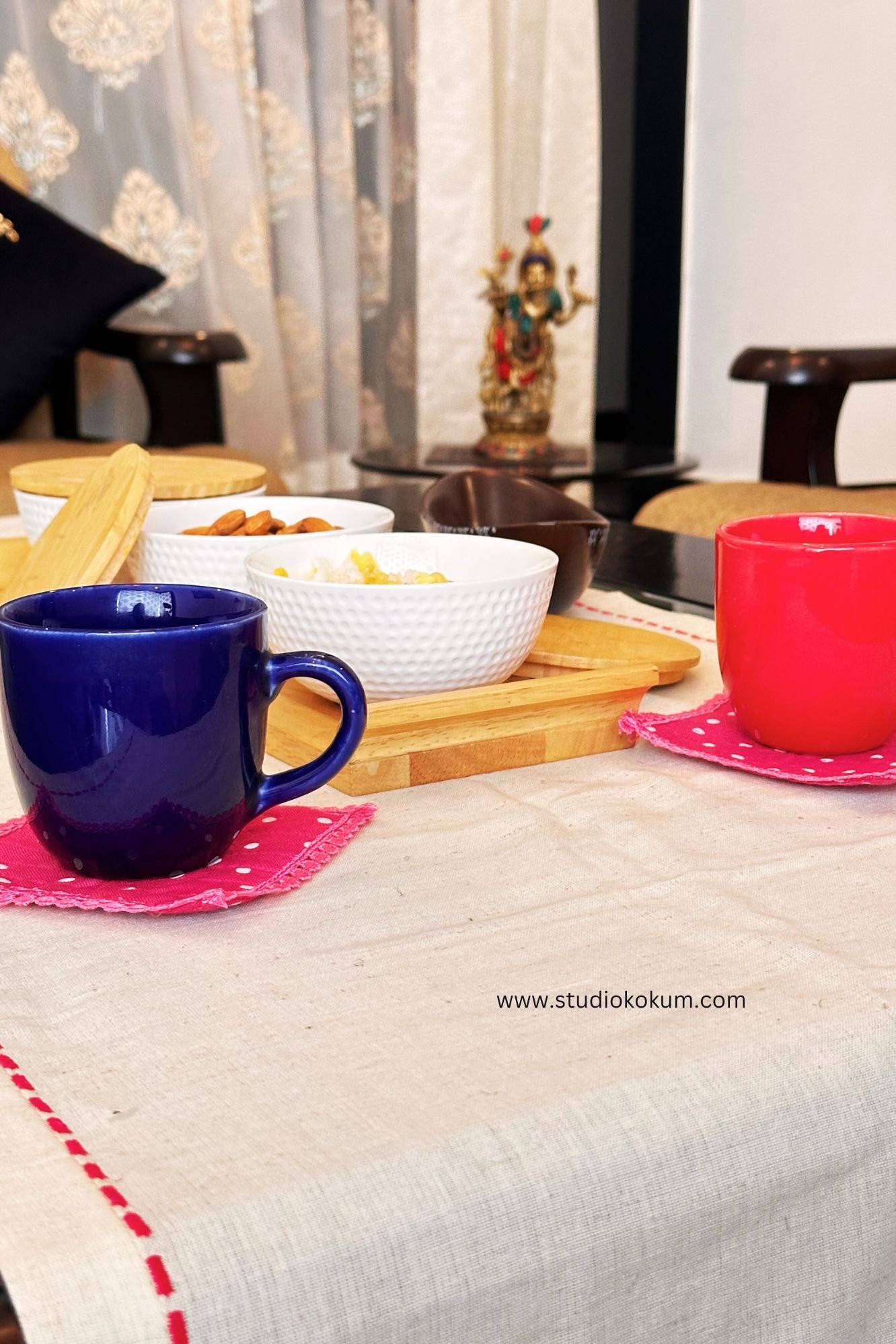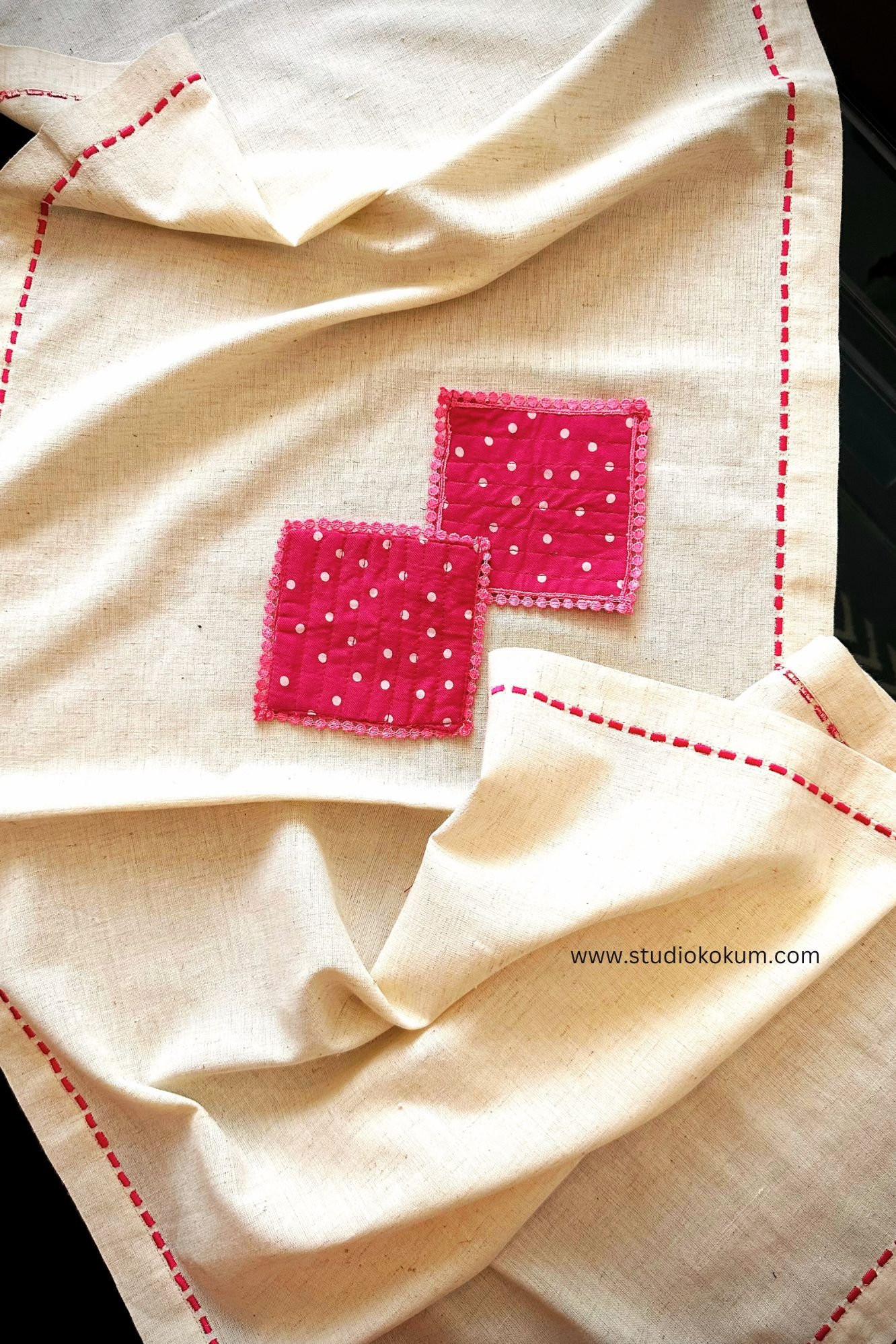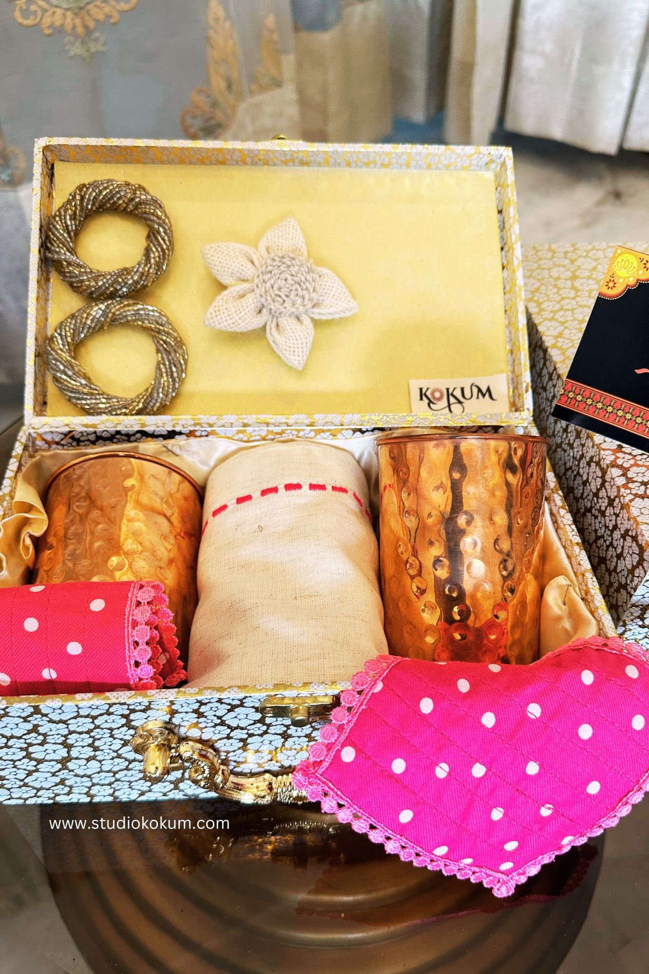 The box also contains two handcrafted fabric coasters, evoking a sense of nostalgia, completing the set are two napkin holder rings and a customized greeting card.